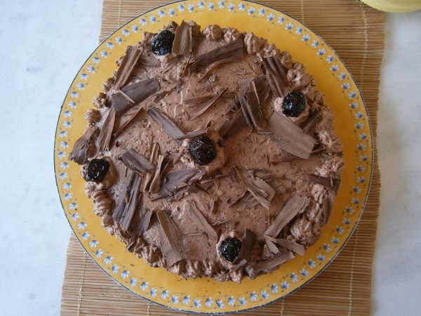 Παίρνουμε το τσέρκι που θα συναρμολογήσουμε την τούρτα το ακουμπάμε πάνω στο παντεσπάνι και το πιέζουμε για να κόψουμε ένα αντίστοιχο στρογγυλό κομμάτι. Προσέχουμε να βάλουμε το τσέρκι στην άκρη για να εκμεταλλευτούμε καλύτερα το μπισκότο της βάσης. Βάζουμε τη βάση μέσα στο τσέρκι κα πάνω σε μια πιατέλα. Τη βρέχουμε με το γάλα που έχουμε ανακατέψει το κακάο. Προσθέτουμε τη μισή κρέμα και στη συνέχεια βάζουμε τα κομμάτια από το παντεσπάνι που περίσσεψε, προσπαθώντας να καλύψουμε την κρέμα. Αλείφουμε πάλι με το γάλα. Τέλος βάζουμε την υπόλοιπη κρέμα, κρατώντας ένα περίπου φλ. για το γύρω- γύρω. Αφήνουμε την τούρτα στο ψυγείο για 4-5 ώρες και στη συνέχεια αφαιρούμε το τσέρκι και με μια σπάτουλα αλείφουμε τα πλάγια με την κρέμα που κρατήσαμε. Διακοσμούμε με κερασάκια και τρούφα.