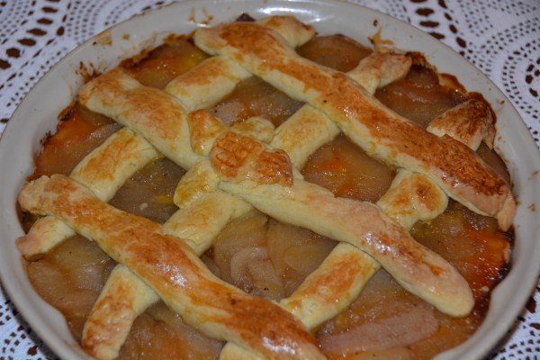 Την υπόλοιπη ζύμη την πλάθουμε με την βοήθεια λίγου έξτρα αλευριού σε λωρίδες και τις βάζουμε πάνω από τη γέμιση σταυρωτά. Είναι μια πολύ εύκολη μηλόπιτα και αξίζει να την προσπαθήσετε!