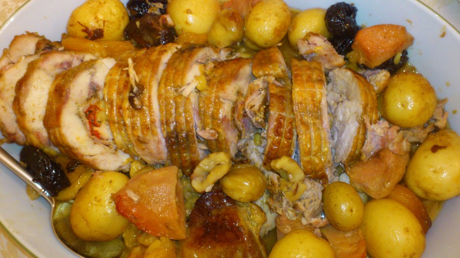 This is an image for Ρολό χοιρινό γεμιστό με δαμάσκηνα και κυδώνια (της Γιάννας).