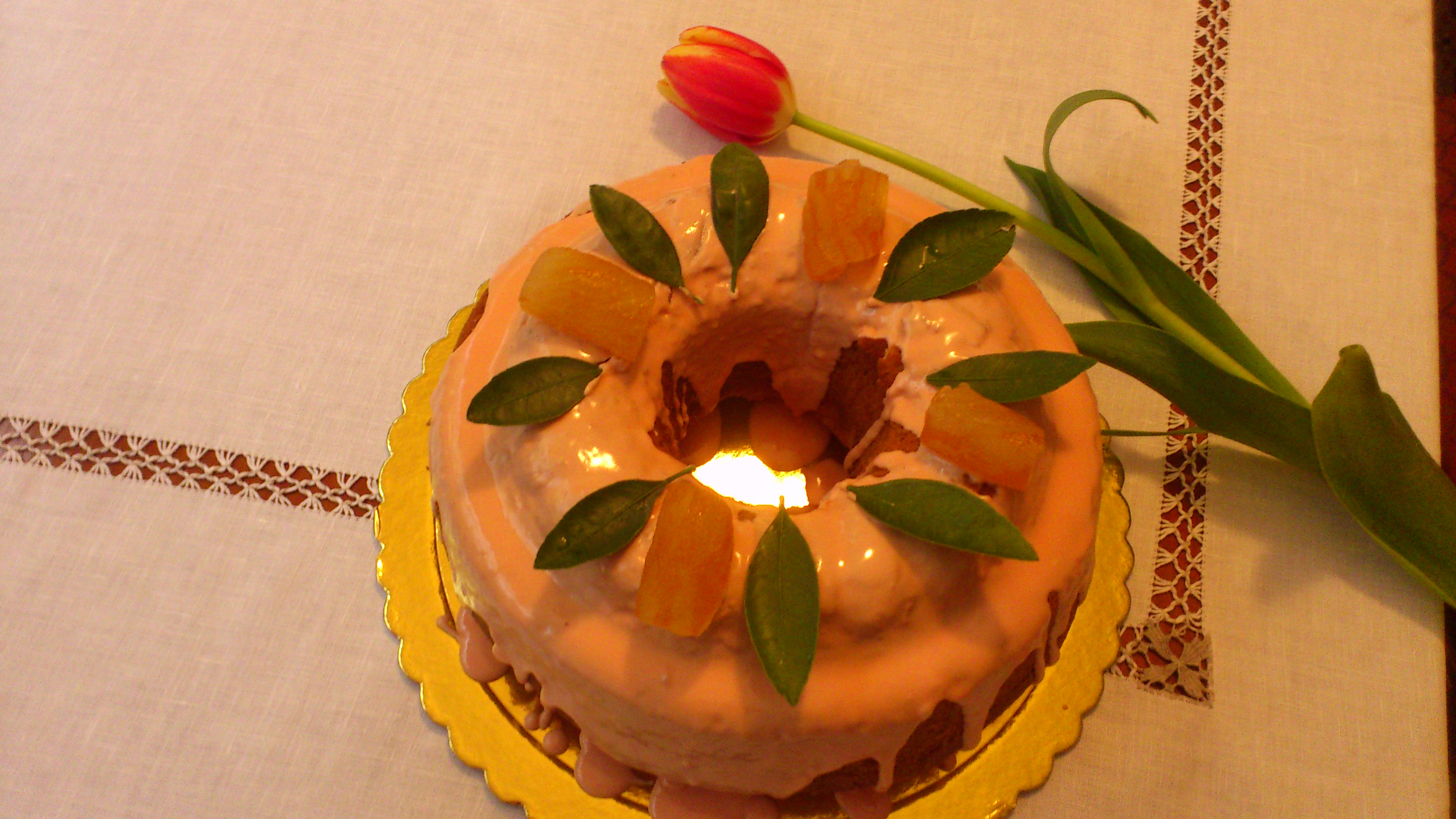 Όταν βγάλετε το κέικ από το φούρνο, το αφήνετε στη φόρμα για 5’-8’ και μετά ξεφορμάρετε για να μην κολλάει και χαλάσει. Το αφήνετε να κρυώσει ΤΕΛΕΙΩΣ και ρίχνετε το γλάσο. Διακοσμείτε με γλυκό του κουταλιού. Εδώ έχουν χρησιμοποιηθεί περγαμόντο και φυλλαράκια από τη λεμονιά μου…