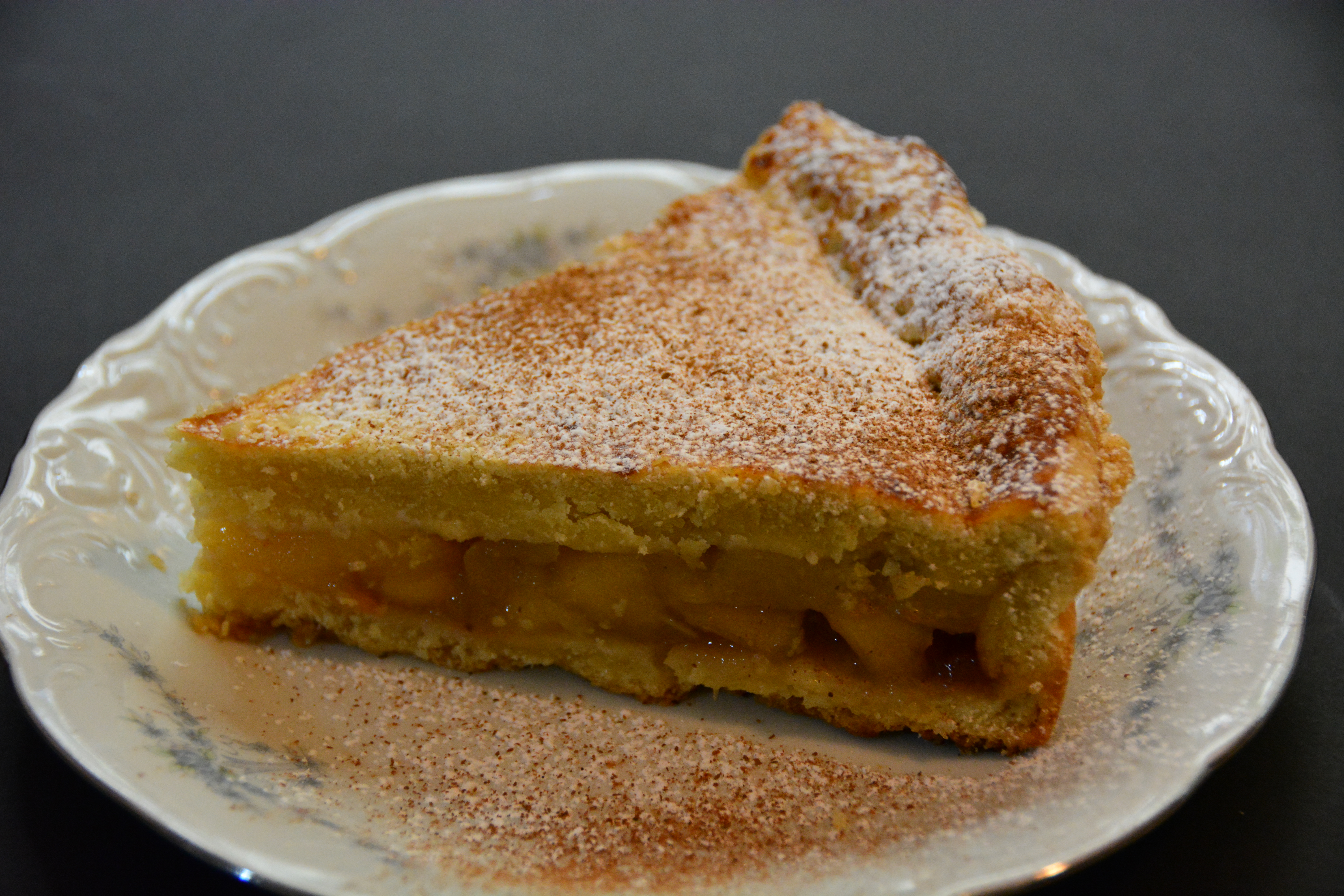 Παίρνετε τα 2/3 ης ζύμης και το τοποθετείτε ανάμεσα σε δυο λαδόκολλες. Ανοίγετε έτσι σε φύλλο του μισού εκατοστού, χωρίς να χρειαστεί να προσθέσετε άλλο αλεύρι, που θα σκλήραινε τη βάση της μηλόπιτας. Αφαιρείτε την επάνω λαδόκολλα και με τη βοήθεια της κάτω, βάζετε τη ζύμη σε μια ταρτιέρα ή ταψάκι διαμέτρου 25 εκατοστών, που έχετε βουτυρώσει και αλευρώσει ελαφρά. Καλύπτετε πιέζοντας με τα χέρια τα τοιχώματα της ταρτιέρας και κόβετε τη ζύμη που προεξέχει. Πριν ρίξετε τη γέμιση αλείψτε τη βάση με λίγη μαρμελάδα και ψήστε τη για 5-10 λεπτά. Έτσι βοηθάτε να μην μαλακώσει η βάση από την υγρή γέμιση και να παραμείνει τραγανή. Ρίχνετε τη γέμιση,αφού αφαιρέσετε την κανέλα και τα γαρύφαλα και έχοντας ανοίξει την υπόλοιπη ζύμη με τον ίδιο τρόπο, καλύψτε τη προσπαθώντας να κολλήσει το φύλλο γύρω-γύρω και να δώσει ένα ωραίο, οπτικά, αποτέλεσμα. Χαράξτε την πίτα με ένα πιρούνι ελαφρά και αλείψτε τη με 1/2 κρόκο αυγού που έχετε διαλύσει σε λίγο νερό. Ψήστε τη μηλόπιτα πάνω σε σχάρα αλλά χαμηλά, για να ψηθεί και η βάση, στους 180ο C, περίπου 45΄ή ώσπου να πάρει ένα ωραίο χρυσαφί χρώμα. Όταν κρυώσει καλά, μπορείτε να την σερβίρετε με παγωτό {εδώ εγώ την παρουσιάζω με παγωτό σοκολάτα-έπεται η συνταγή}, ή την πασπαλίζετε με λίγη ζάχαρη άχνη και λίγη κανέλα. Γίνεται υπέροχη.