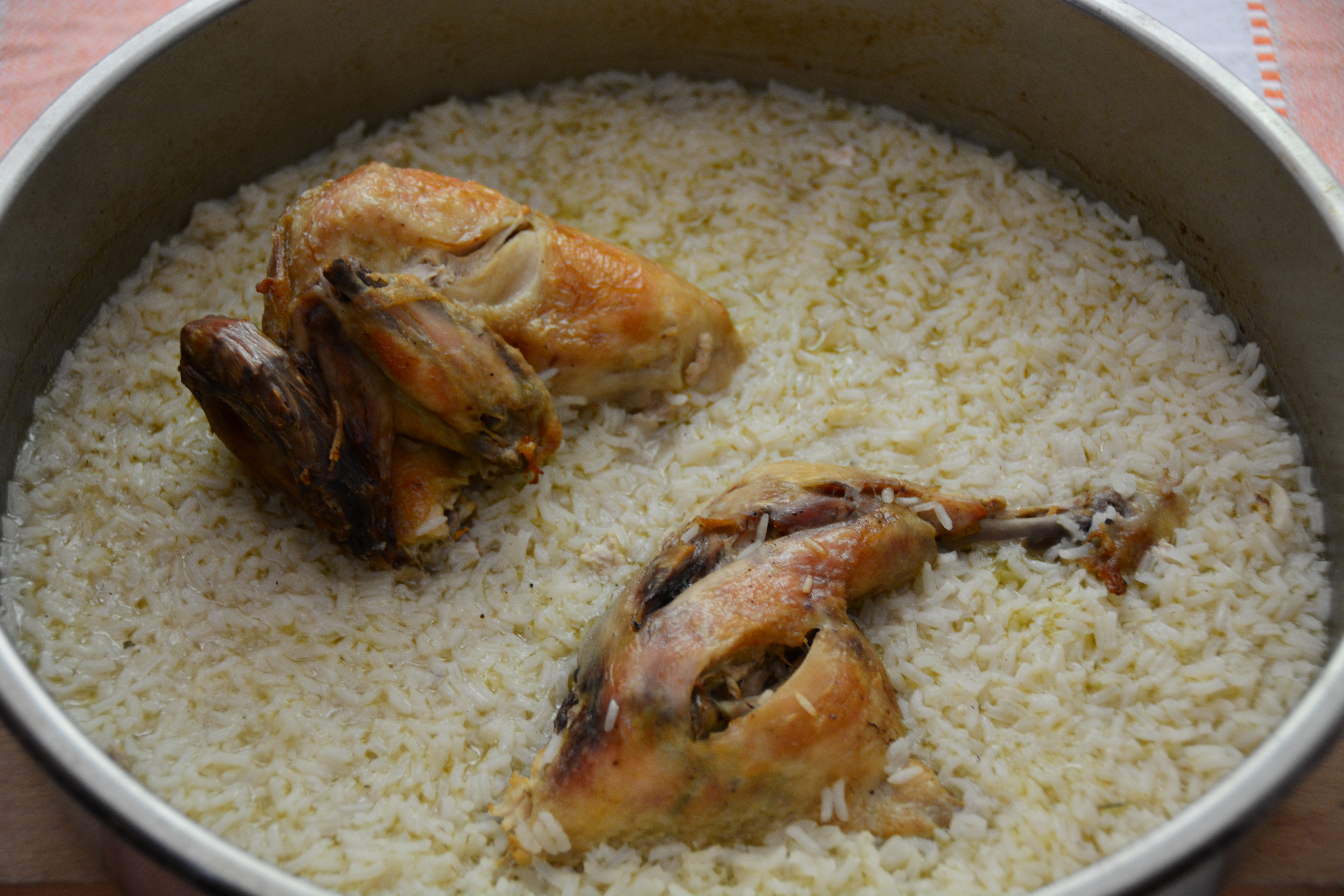 Βάζετε το κοτόπουλο σε ταψί με καπάκι ή γάστρα. Μπήγετε στο κρέας το σκόρδο, το αλατοπιπερώνετε και προσθέτετε τα υπόλοιπα υλικά, μαζί με ½ λίτρο καυτό νερό. Το ψήνετε για ¾ της ώρας σε μέτρια φωτιά με κλειστό το καπάκι. Στη συνέχεια ανοίγετε να πάρει χρώμα και από τις δυο μεριές και 10΄πριν το βγάλετε από το φούρνο, ρίχνετε το ρύζι και προσθέτετε 4 περίπου φλιτζάνια καυτό πάντα νερό,* απλώνοντας το στο ταψί, με ΞΥΛΙΝΗ κουτάλα και ξανακλείνετε το καπάκι**. Σε 10-12΄ανοίγετε και θα έχετε το τέλειο πιλάφι. Σερβίρετε το φαγητό, με γιαούρτι και ένα μπουκάλι δροσερό μοσχοφίλερο. Και τα δύο το απογειώνουν!