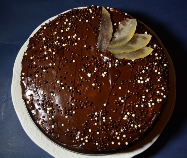 Σε ένα τσέρκι 22-25 εκατοστά βάζουμε μια στρώση παντεσπάνι, που κόβουμε με το ίδιο το τσέρκι, ώστε να έχει την ίδια διάμετρο, αλείφουμε με λίγο γάλα που έχουμε προσθέσει κάποιο λικέρ και απλώνουμε τη μισή κρέμα. Με το υπόλοιπο κομμάτι σκεπάζουμε την κρέμα, αλείφουμε με το γάλα και στρώνουμε την υπόλοιπη κρέμα. Αφήνουμε το γλυκό στο ψυγείο για ένα βράδυ και την επόμενη, το ξεφορμάρουμε, στρώνουμε με μια σπάτουλα την κρέμα γύρω-γύρω και ρίχνουμε και απλώνουμε τη γκανάζ, που πρέπει να φτιάξουμε τη δεύτερη μέρα για να μην πήξει. Στολίζουμε την τούρτα μας με υλικά που διαθέτουμε και αφήνουμε 1 ώρα στο ψυγείο, πριν τη σερβίρουμε.