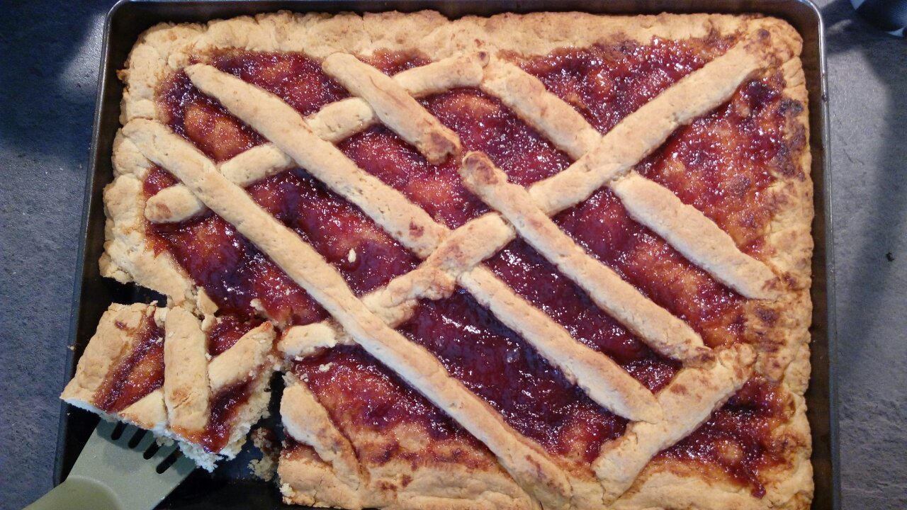 Χτυπάτε το βούτυρο και τη μαργαρίνη με τη ζάχαρη, στη μέτρια ταχύτητα του μίξερ να αφρατέψουν. Ρίχνετε ένα-ένα τα αυγά και τους κρόκους, μέχρι να έχετε μια ζύμη στο χρώμα του λεμονιού. Προσθέτετε το κονιάκ, το ξύσμα πορτοκαλιού και το αλεύρι, σταδιακά, έως ότου δημιουργηθεί μια ζύμη πολύ μαλακή που ΔΕΝ μπορεί να ανοιχθεί με πλάστη. Σε ταψί ρηχό ή στη λαμαρίνα του φούρνου που έχετε βουτυρώσει και αλευρώσει ελαφρά, απλώνετε τα ⅔ της ζύμης με τα χέρια σας, προσπαθώντας να καλύψετε και τα τοιχώματα του ταψιού σε ύψος 2 περίπου εκ. Απλώνετε τη μαρμελάδα, και με την υπόλοιπη ζύμη, φτιάχνετε κορδονάκια με τη βοήθεια λίγου αλευριού και τα βάζετε διαγώνια, πάνω από τη μαρμελάδα.